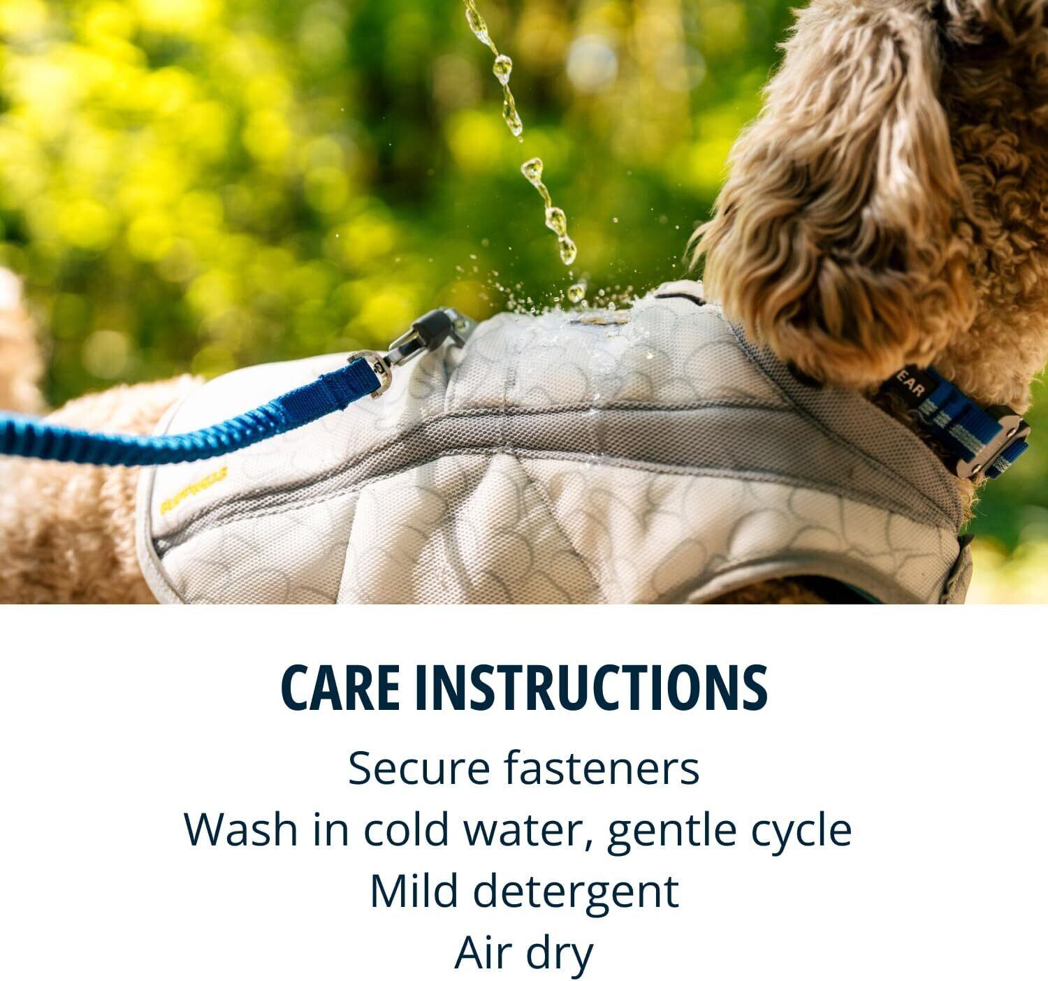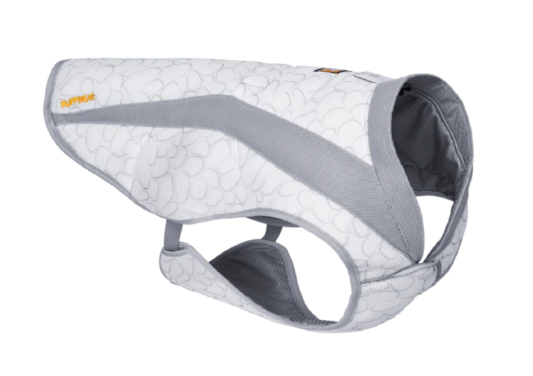 気化熱(蒸発冷却効果)を利用して愛犬を冷やすクーリングウェアです。生地は、ラフウェア独自のSwamp Cooler技術を使用した3層構造になっていて、吸湿発散性のある外層が熱を反射し蒸発を促進、吸収性の高い中間層は十分な水を蓄え、メッシュの裏地が愛犬をドライで快適に保ちます。水が蒸発するときに愛犬の熱を吸収するため、その効果が長時間継続するように、中間層にはより多くの水分が蓄えられる構造になっています。着用前に水に浸すか、水筒や蛇口から水をかけて使用します。乾いてきた時には、着用したまま水をかけて水分をリチャージすることもできます。UPF50+の明るい色の生地は日光を反射、遮光し、日差しから愛犬を守ります。サイドリリースバックルで簡単に装着でき、アジャスターでサイズの調整もできます。また、背面にはリーシュポータルもあるので、ハーネスの上から着用することができます。